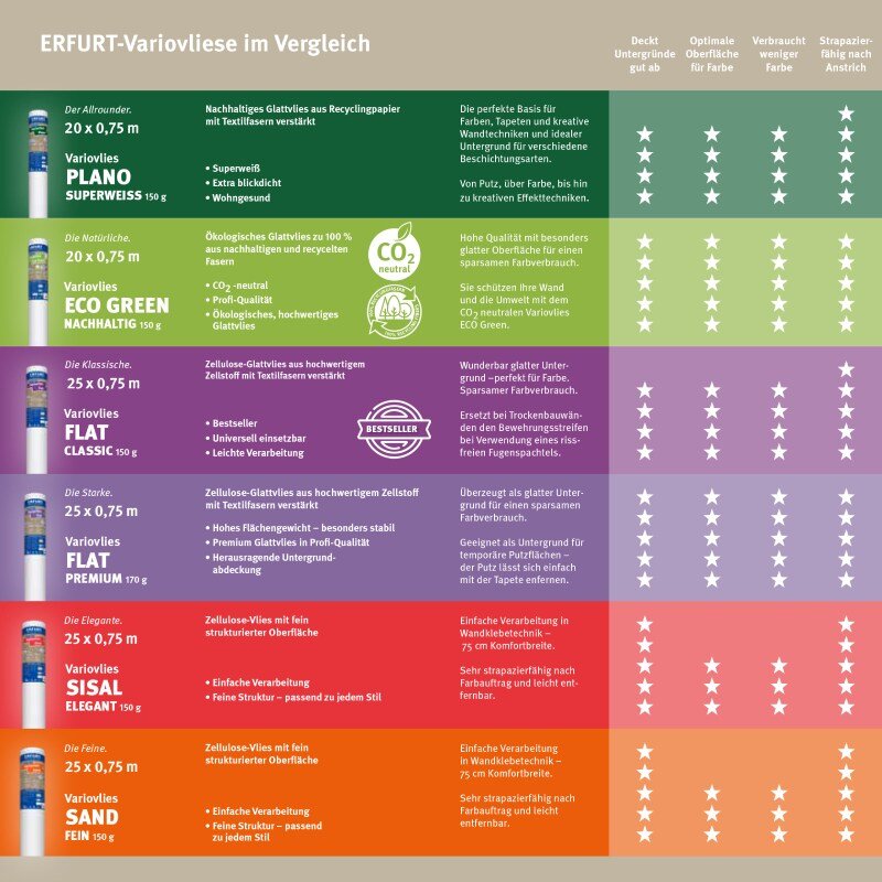 ERFURT-Variovlies Flat Classic (25 m x 0,75 m) ist rissüberbrückend (für Risse der Klasse A1), gleicht Unebenheiten aus und sorgt für dauerhaft glatte Wände. Es ist dimensionsstabil und lässt sich schnell und einfach ohne Weichzeit mit einem Vliestapetenkleister in Wandklebetechnik verarbeiten. Dank der praktischen Komfortbreite von 75 cm entstehen bei der Verarbeitung weniger Nähte. Das Glattvlies ist mehrfach überstreichbar. Für den Anstrich empfehlen wir hochwertige Dispersionsfarbe (min. Nassabriebklasse 3 nach DIN EN 13300).