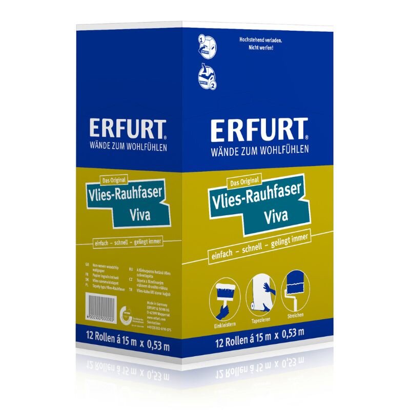 ERFURT Vlies-Rauhfaser Viva ist umweltfreundlich, wohngesund, frei von Glasfasern, PVC und Weichmachern, atmungsaktiv, feuchtigkeitsregulierend und für Allergiker geeignet (TÜV geprüft). Die Verarbeitung ist leicht: Wand mit Vliestapetenkleister einkleistern, ohne Weichzeit ansatzfrei an die Wand kleben und blasenfrei andrücken. Die Tapete ist außerdem strapazierfähig, schwer entflammbar gem. DIN EN 13501-1, rissüberbrückend für Risse der Klasse A1 und sie egalisiert Unebenheiten.